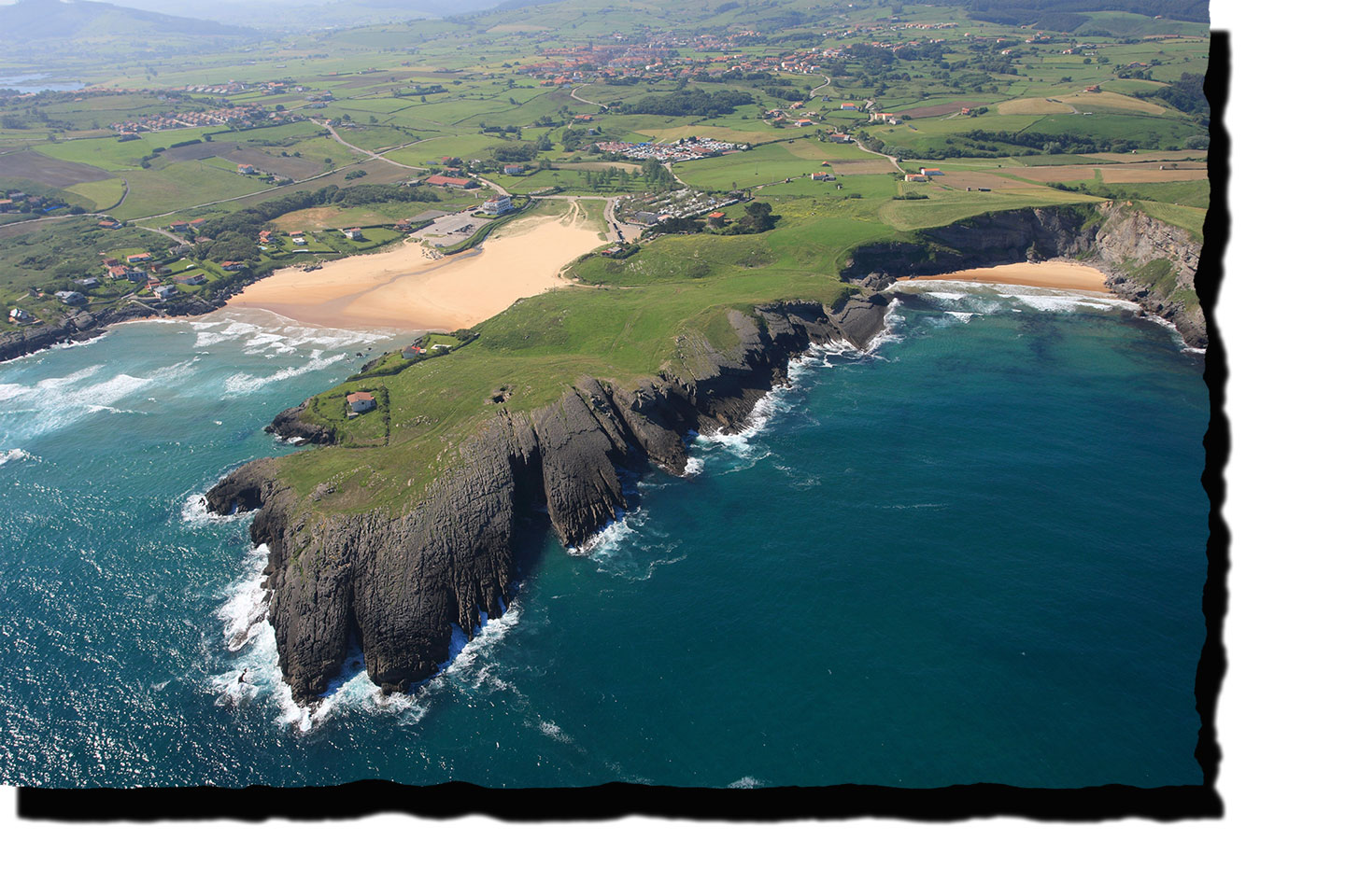 Vista aérea apreciando la cala Antuerta en todo su esplendor junto a la playa Cuberris, el Camping Playa de Ajo al fondo.